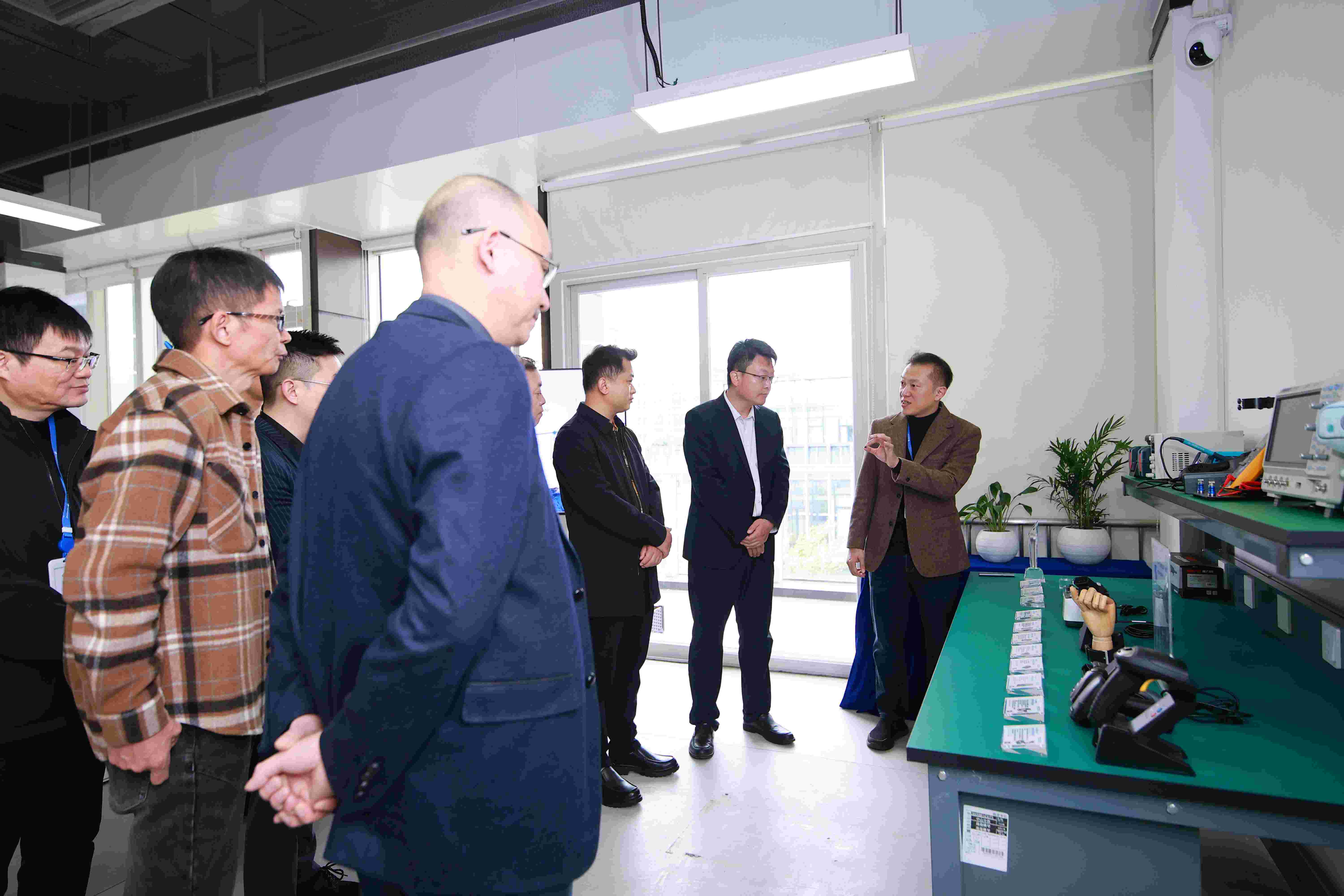 ▲在新落成的z6com尊龙优迈捷办公场地内,展示了多款自主研发的产品;z6com尊龙优迈捷公司总经理郭锋(右一)向来访嘉宾介绍公司产品及技术