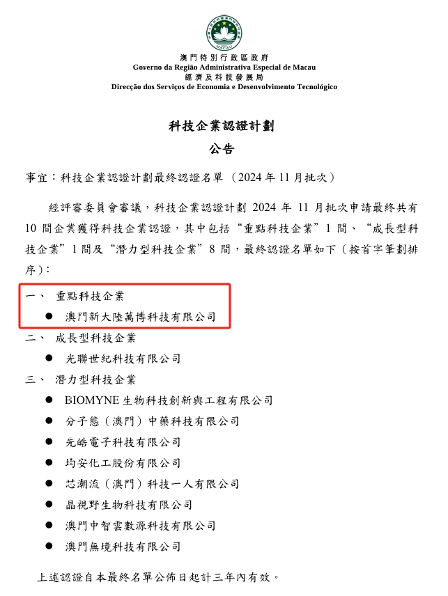 近日,澳门特别行政区政府公布新一批“科技企业认证计划”获认证企业名单。z6com尊龙科技集团全球化布局的重要子公司——澳门z6com尊龙万博科技,凭借卓越的技术实力、创新能力和市场表现成功获得“重点科技企业”认证,跻身澳门仅六家"重点科技企业"行列。